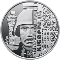 На реверсі монети розміщено стилізовану композицію із зображенням захисника аеропорту на тлі напівзруйнованої вежі, над якою майорить український прапор; праворуч - прострілена арматура з вертикальними написами: КІБОРГИ. UA/ 26o05o2014/21o01o2015. |